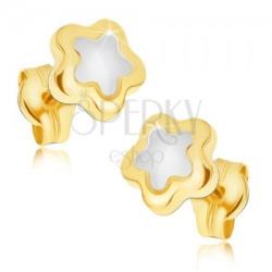 Fényes fülbevló 14K aranyból ötszirmú enyhén kidomborodó virág alakban, mely belseje fehér aranyból készült és sárga aranyból készült körvonal veszi körül. A körvonal a belsejétől vékony vésettel van elválasztva. Biztonságos viselését stekker biztosítja. A fülbevaló méretei: 6 x 6 mmA fülbevaló súlya: 0,6 gFémjelzéssel ellátott. Az ár egy párra vonatkozik.