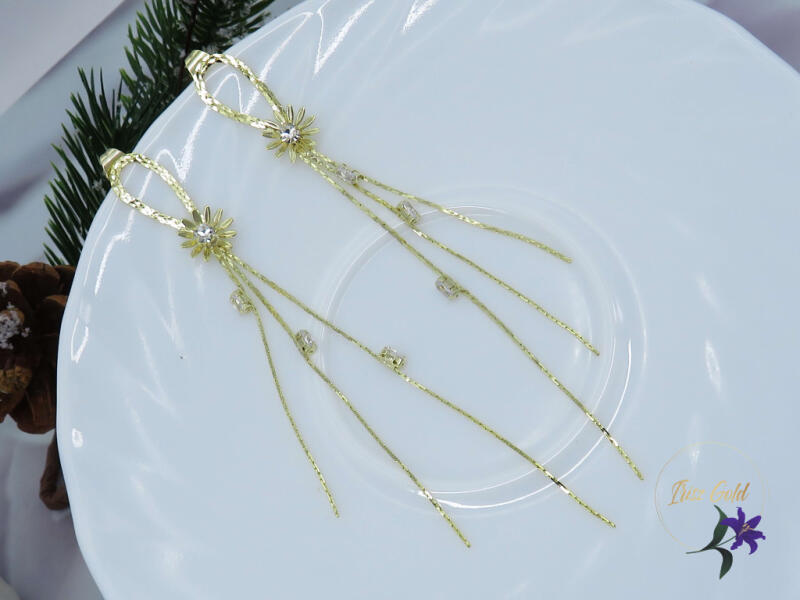 Gold filled elegant hosszú csöngős fülbevaló kis virág teszi egyedivé és a szálon lévő kis kövek Nagyon mutatós darab Szin: 14K Méret: 11 cm x10 mm bedugós . szár 10 mm A forgalmazott divatékszerek alapanyaga nikkel és ólommentes ezért többnyire nem okoznak allergiás tüneteket, nyugodtan hordhatják fémérzékeny emberek is. Általában nem színezik a bőrt és más divat