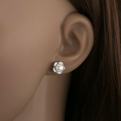 925 ezüst fülbevaló ragyogó virág alakban, mely öt darab lekerekített sziromból és egy fehér gyöngyből áll. A szirmok csillogó tiszta cirkóniákkal vannak kirakva. Biztonságos viselését a szilikon végdugó biztosítja. A virág átmérője: 8 mmA fülbevaló súlya: 1,6 gFémjelzéssel ellátott. Az ár egy párra vonatkozik.