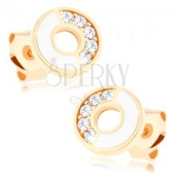 Fülbevaló 9K sárga aranyból kör kontúrral fehér és csillogó féllel. Az egyik rész fényes fehér fénymázzal fedett a másik pedig csillogó cirkóniákkal van kirakva. Biztonságos viselését stekker biztosítja. A fülbevaló méretei: 6 mmA fülbevaló súlya: 0,5 gFémjelzéssel ellátott. Az ár egy párra vonatkozik.