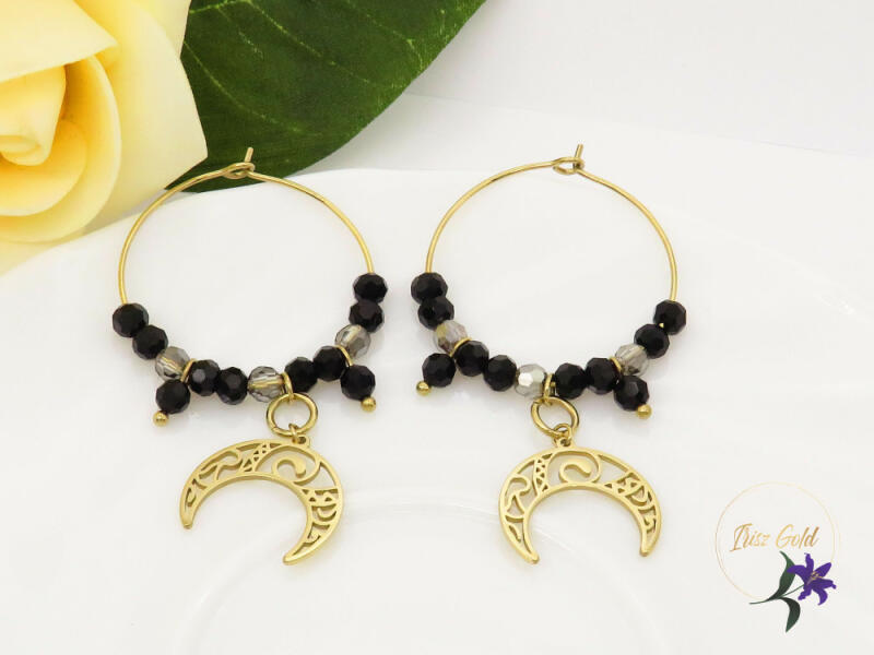 Antiallergén nemesacél karika fülbevaló kis gyöngyökkel különlegessége a csipkemintázatú félhold Szin: 18K Méret: 3cm csüngő dísszel 5,3 mm A forgalmazott divatékszerek alapanyaga nikkel és ólommentes ezért többnyire nem okoznak allergiás tüneteket, nyugodtan hordhatják fémérzékeny emberek is. Általában nem színezik a bőrt és más divatékszerekhez képest nagyságr