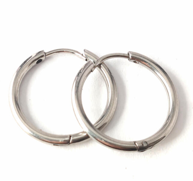 Ezüstszínű nemesacél (316L) karika fülbevaló. Időtálló ékszer, nem kopik, víz hatására nem feketedik. Mindennapi használatra is alkalmas. Antiallergén ékszer. A nemesacél ékszerek rendkívül népszerűek kedvező tulajdonságaik miatt. A nemesacél semmilyen nikkelsót nem bocsájt ki magából, ennek következtében teljesen allergiamentes, semmiféle bőrirritációt nem vált