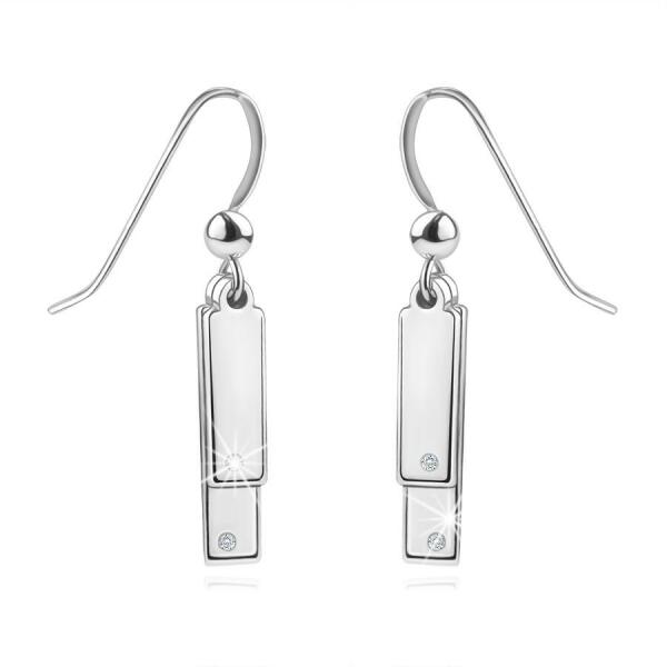 A 925 ezüstből készült fülbevalókat egy kisebb és egy nagyobb sima vékony téglalapot ábrázol. Mindkét téglalapot egy-egy kerek átlátszó gyémánt díszíti. A fülbevalók rögzítése afrikai akasztóval történik, díszes golyókkal. A fülbevaló platina bevonattal rendelkezik. A kisebbik téglalap méretei: 4 x 13 mmNagyobb téglalap méretei: 4 x 18 mmGyémánt átmérője: 1