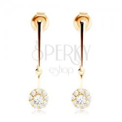 Fülbevaló 14K sárga aranyból vékony lekerekített pálcával, mely lefelé haladva enyhén keskenyedik és kis domború karika függ rajta rövid vékony pálcával, ez csillogó átlátszó cirkóniákkal van kirakva. A fülbevaló kapcsolása stekkeres. Fülbevaló mérete: 4 x 19 mmFülbevaló súlya: 0,6 gFémjelzéssel ellátott. Az ár egy párra vonatkozik.