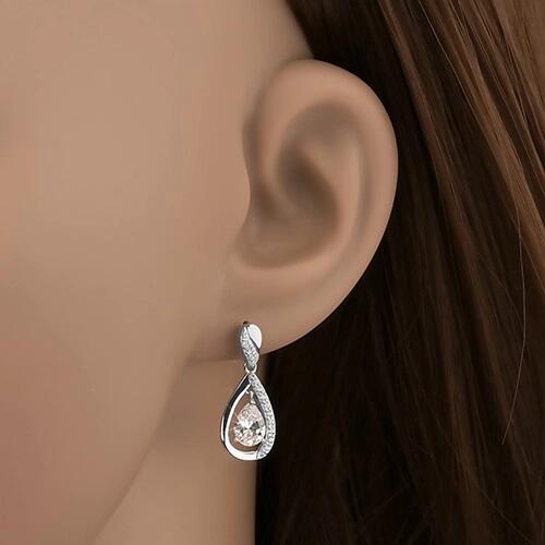 925 ezüst fülbevaló, mely egy kisebb fordított könnycseppből áll, amely alatt egy nagyobb csepp kontúrja függ. Mindkét íven pici áttetsző cirkónia díszítés húzódik. A kontúr közepén egy nagy áttetsző cirkónia található, könycsepp alakra csiszolva. A fülbevalók felülete ródiummal kezelt, kapcsolása stekkeres. A fülbevaló mérete: 9 x 22 mmA fülbevaló súlya: 2,8
