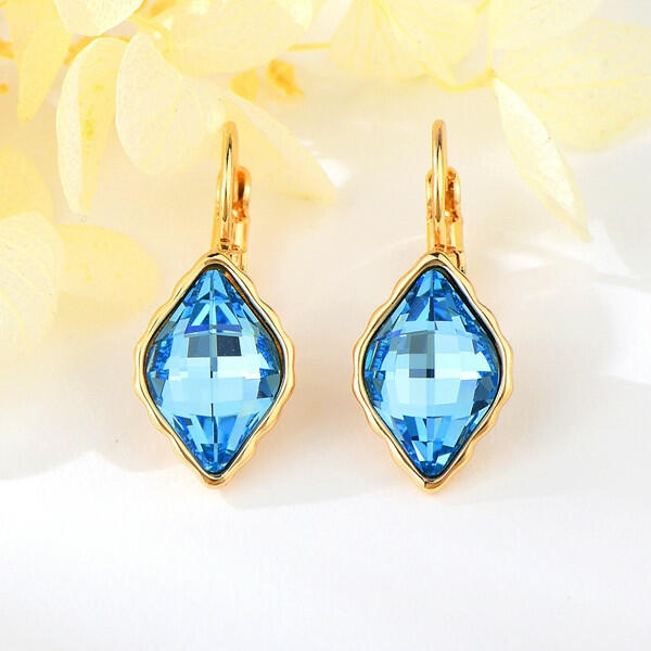 Cikkszám: 0383 Akasztós, kapcsos fülbevaló: - arany bevonattal, - égszínkék Swarovski kristállyal. Hossza: 3 cm. A kristály átmérői: 1 cm x 1,5 cm. Súlya: 4 g / pár. Alapanyaga: minőségi fémötvözet. Gyönyörű Swarovski kristályos ékszer. A megadott méreteket kérjük vegyék figyelembe!