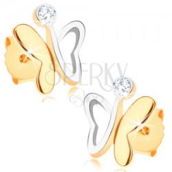 Ródiummal ellátott fülbevaló 9K aranyból kis fényes és sima felszínű pillangóval. A fejecskét kerek átlátszó cirkónia alkotja fényes foglalatba ültetve. A szárnyak alakja szabálytalan, miközben az egyik szárnya sárga a másik pedig fehér aranyból készült. A fülbevaló kapcsolása stekkeres. Fülbevaló méretei: 7 x 8 mmFülbevaló súlya: 0,5 gFémjelzéssel ellátott.