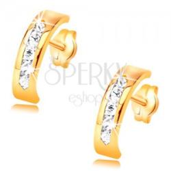 A sárga 14K arany fülbevalót egy szélesebb ív alkotja, amelyet középen beültetett, csillogó, átlátszó cirkóniák díszítenek. A felülete sima és fényes. Biztonságos viselését stekker teszi lehetővé. Fülbevaló méretei: 4 x 13 mmFülbevaló súlya: 1,1 gFémjelzéssel ellátott. Az ár egy párra vonatkozik.