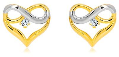 A 14K kombinált arany fülbevalót fényes kivágott szív kontúr alkotja. A felső részben egy végtelent ábrázoló szimbólum található, melynek egy része fehér arany. A szív közepén csiszolt kerek tiszta cirkónia helyezkedik el négykarmos foglalatban. A fülbevaló biztonságos viselését stekker teszi lehetővé. Fülbevaló méretei: 10 x 9 mmFülbevaló súlya: 0,7 gFémjelzé