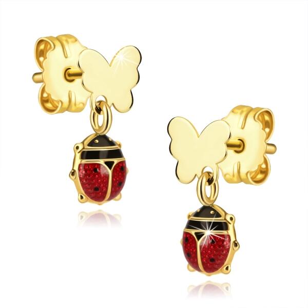 14K sárga arany fülbevaló egy sima és tükörfényes, lapos, pillangóval. Alatta egy sima katicabogár van rögzítve, piros szárnyakkal, fekete fejjel és négy fekete ponttal a szárnyakon. Az egyes testrészeket arany szegély választja el egymástól. A fülbevaló stekkerzárral rendelkezik. A fülbevaló mérete: 5 x 9,5 mmA fülbevaló súlya: 0,48 gFémjel - Van. Az ár egy párra v