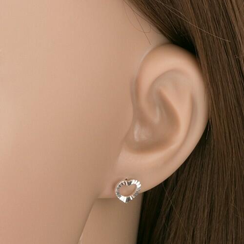 Fülbevaló 925 ezüstből, egyenletes szív körvonalal, amelyen a ferde bemetszés rovátkolt felületet alkot. Bedugós fülbevaló. A fülbevaló méretei: 9 x 8 mm A fülbevaló súlya: 0,6 gFémjelzéssel ellátottAz ár egy párra vonatkozik.