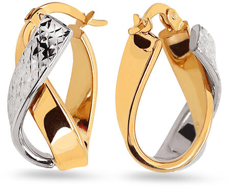 Arany fülbevaló kombinált aranyból. A fülbevaló két egymásba fonódó arany vonalból készült. Az egyik vonal felületét ródium bevonattal és gravírozással kombinálják.