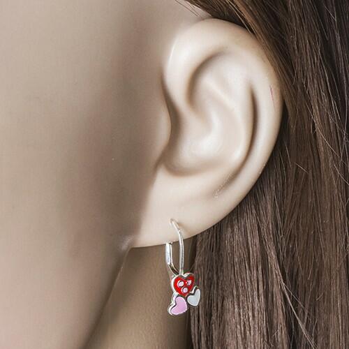 A 925 ezüst fülbevaló három apró, lapos szív formából áll. A nagyobb szív formát sötét rózsaszín fénymáz fedi három apró világos rózsaszín ponttal. Alatta két kisebb szív forma van odafogatva világos rózsaszín és fehér színben. Zárszerkezete patentos. Díszes rész méretei: 8 x 9 mmFülbevaló méretei (kapoccsal): 8 x 19 mmFülbevaló súlya: 1,5 gFémjelzéssel el