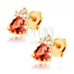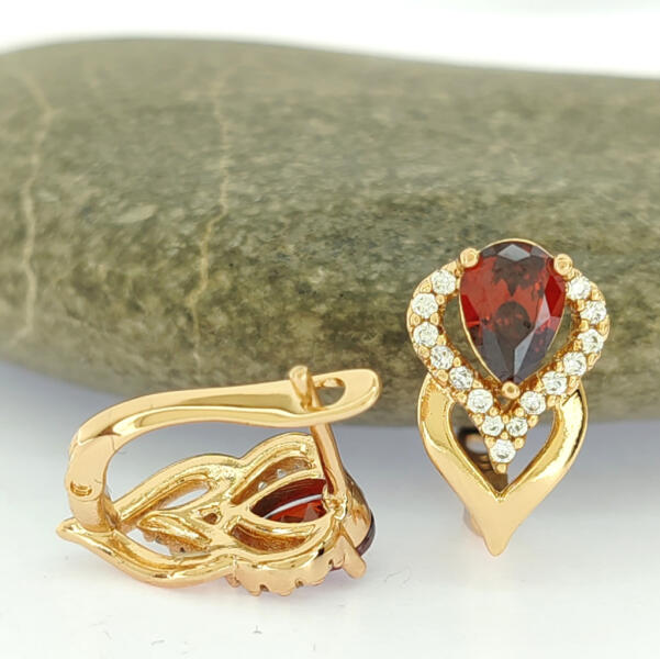 Fülbevaló 14K sárga aranyból átlátszó, cirkóniás koronával, amely alatt egy csiszolt háromszög alakú gránát helyezkedik el piros árnyalatban. Biztonságos viselését stekker biztosítja. A fülbevaló méretei: 5 x 6 mmA fülbevaló súlya: 0,5 gFémjelzéssel ellátott. Az ár egy párra vonatkozik.