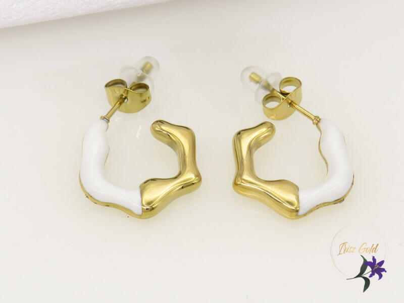Antiallergén egyedi tervezésű karika fülbevaló egy kis részén fehér tűzzománc Szin: 14K Méret: 15x15mm Bedugós . szilikon védővel A forgalmazott divatékszerek alapanyaga nikkel és ólommentes ezért többnyire nem okoznak allergiás tüneteket, nyugodtan hordhatják fémérzékeny emberek is. Általában nem színezik a bőrt és más divatékszerekhez képest nagyságrendekkel job
