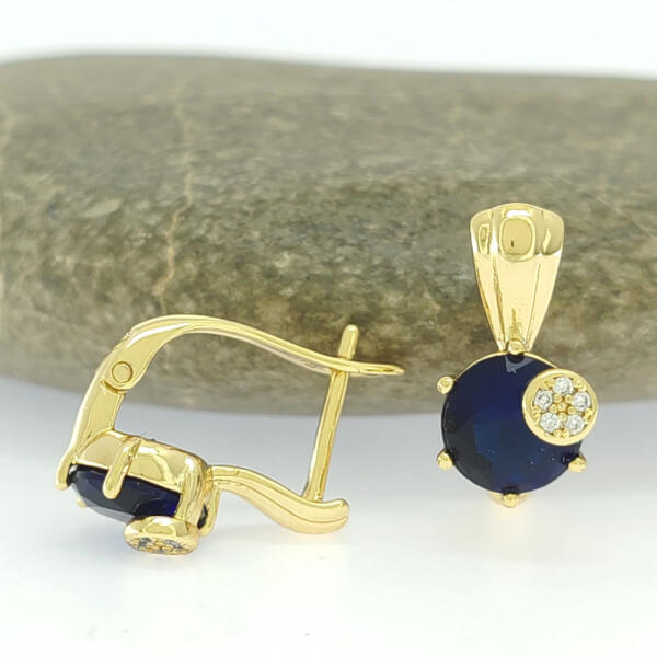 Aranysárga színű fülbevaló, melyet királykék és fehér cirkónia kristályok tesznek csillogóvá. A kristályok karmos foglalatban helyezkednek el. Időtálló darab, nem kopik, nem feketedik, nem színezi a bőrt. Antiallergén ékszer, nem okoz panaszokat fémérzékeny hölgyeknek sem. 14K arany színben kapható. Fülbevaló teljes hossza: 15 mm. Fülbevaló szélessége: 8 mm. Kapcso