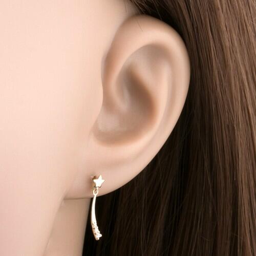 Fülbevaló 14K sárga aranyból csillag alakban, mely lapos ötágú csillagból és függő három átlátszó cirkóniával díszített vonalból áll, miközben felfelé haladva szélesedik. A fülbevaló kapcsolása stekkeres. Fülbevaló mérete: 4 x 17 mmSúly: 0,44 gFémjelzéssel ellátott. Az ár egy párra vonatkozik.
