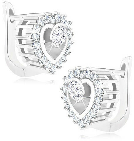 A 925 ezüst fülbevaló ródiummal kezelt felületű és szív körvonal alakú, amely átlátszó csillogó cirkóniákkal van kirakva. A szélét hosszú pálcák díszítik, amely bordázott megjelenést kölcsönöz neki. A közepében egy fényes szív körvonal található, amelybe egy kerek, átlátszó, pálcával rögzített cirkónia van helyezve. Orosz-zár. A fülbevaló mérete: 12 x