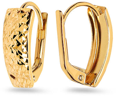 Elegáns fülbevaló, amely minden nő számára megfelelő, aki a divatban szeretne járni. Atipikus alakjuk van, amely a felső részen kitágul. Fenomenális megjelenésüket precízen csillogó keresztmetszet díszíti, amely megsokszorozza a sárga arany szépségét. A biztonságos és kényelmes viselet garanciája a használt klasszikus női patentos rögzítés - Monacella.