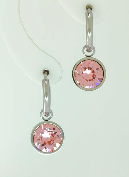 Ezüstszínű nemesacél (316L) karika fülbevaló, melyet rózsaszín kristályos függő díszít. A kristály ragasztott, peremezett foglalatban helyezkedik el. Időtálló ékszer, nem kopik, víz hatására nem feketedik. Mindennapi használatra is alkalmas. Antiallergén ékszer. Karika belső átmérője: 10 mm. Karika szélessége: 2 mm. Fülbevaló teljes hossza: 24 mm. Függő átmérőj
