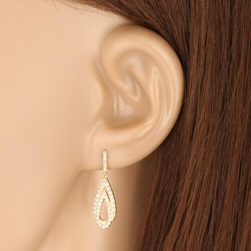 A 9K sárga arany fülbevaló egy keskeny, cirkóniákkal kirakott pálcából áll. A cirkónia vonal alján egy csepp körvonala függ. A nagyobb körvonalat egy kisebb körvonal egészíti ki, ugyanakkor az azonos formájú körvoal kissé lejjebb helyezekdik el. Mindkét körvonal elülső része csillogó, átlátszó cirkóniákkal van díszítve. Stekkeres zárszerkezet. A fülbevaló mére