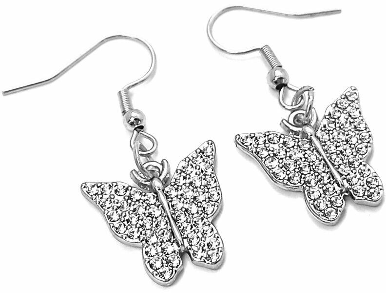 Kristály pillangós fülbevaló. Paraméterek: Med ál / mérete kb. 1,8 cm. Anyaga fémötvözet és kristály. Akasztó rozsdamentes acél.