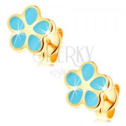 585 arany fülbevaló világoskék fénymázas virággal. A virágnak öt lekerekített szirma van, fényes és arany a szegélye. A fülbevaló kapcsolása stekkeres. A fülbevaló méretei: 7 x 7 mmSúly: 0,4 gFémjelzéssel ellátott. Az ár egy párra vonatkozik.