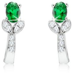 Ezüst fülbevaló virág alakban, amely, ovális, csiszolt, zöld kőből áll, négy karommal odaerősítve. A kő alatt egy szár található két levéllel, amely kisebb, átlátszó cirkóniákkal van kirakva. Pattintós kapoccsal záródik. A fülbevaló méretei: 6 x 16 mmA fülbevaló súlya: 3,56 gFémjelzéssel ellátott. Az ár egy párra vonatkozik.