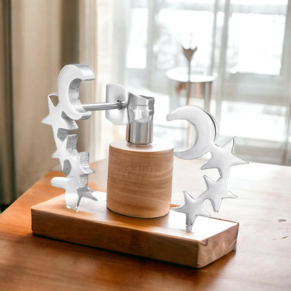 A Hold és csillagok acél fülbevaló egy különleges és stílusos ékszer, amely a női szépséget és eleganciát emeli ki. Egyedi tervezésű és kézzel készült, ezt a fülbevalót minden modern nő imádni fogja. Az fülbevaló fő elemei a hold és a csillagok motívumai, amelyek visszafogott ragyogással önálló személyiséget kölcsönöznek e darabnak. Az ezüstös acél anyagán