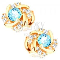 Fülbevaló, amely 14K sárga színű aranyból készült és virág alakú, miközben a közepét kerek alakúra csiszolt kék árnyalatú topáz díszíti. A virág szirmai váltakoznak a sima, fényes vonalak, mérsékelten domború felülettel és az átlátszó cirkóniás szakaszokkal. Biztonságos viselését a stekker biztosítja. A fülbevaló méretei: 8 x 8 mmA fülbevaló súlya: 1,2 g