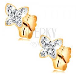 A sárga 14K arany fülbevalót egy csillogó lepke alkotja, amely fényes, átlátszó Swarovski kristályokkal van kirakva. A kristályok fehér anyagba vannak beültetve. A lepke széle keskeny, sima és fényes. Biztonságos viselését stekker teszi lehetővé. Fülbevaló méretei: 5 x 4 mmFülbevaló súlya: 0,49 gFémjelzéssel ellátott. Az ár egy párra vonatkozik.