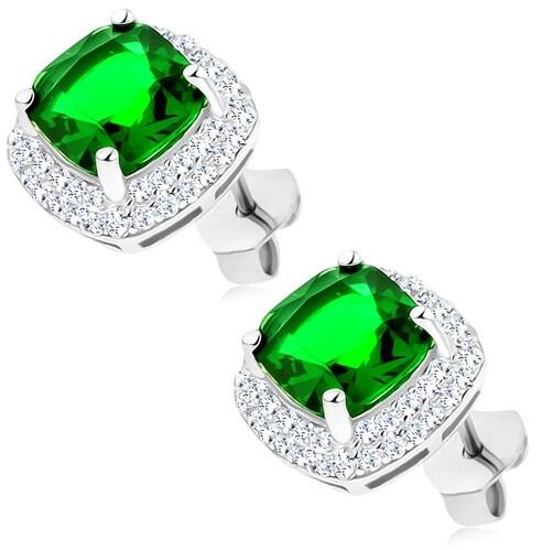 Beszúrós fülbevaló 925 ezüstből smaragdzöld négyzet alakra csiszolt cirkóniával, lekerekített csúcsokkal, melyek felszíne csiszolt és csillogó. A négyzet körül kettős apró átlátszó kövekkel kirakott szegély húzódik. A fülbevaló kapcsolása stekkeres. Fülbevaló mérete: 10 x 10 mmFülbevaló súlya: 3,04 gFémjelzéssel ellátott. Az ár egy párra vonatkozik. A ródi