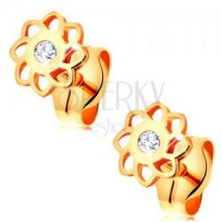 585 sárga arany fülbevaló apró virág alakban, amely szirmai enyhén hajlítottak. Középen egy csillogó cirkónia helyezkedik el. Biztonságos viselését stekker teszi lehetővé. Méret: 5 x 5 mmSúly: 0,3 g Fémjelzéssel ellátott. Az ár egy párra vonatkozik.
