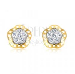 585 kombinált arany fülbevaló virág motívum. A virág szélei vésettek és sárga aranyból készültek, a belső rész fehér arany. Felületén hat apró, csillogó cirkónia helyezkedik el. Zárszerkezete stekkeres. Fülbevaló mérete: 7 x 7 mmFülbevaló súlya: 0,4 gFémjelzéssel ellátott. Az ár egy párra vonatkozik.