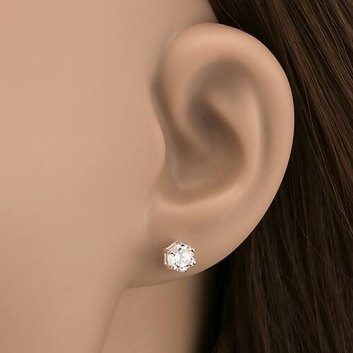 925 ezüstből készült bedugós fülbevaló. A hatkarmos dupla aljzatú fogatba csiszolt kör alakú cirkónia van helyezve. A fülbevaló biztonságos viselését a hátulján tatlálható végdugó biztosítja. A cirkonkő átmérője: 5 mmA fülbevaló tömege: 1,08 gFémjelzéssel ellátott. Az ár egy párra vonatkozik.