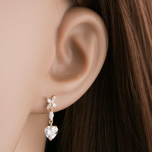 Fülbevaló 14K sárga aranyból virág, szem és szív alakban, mely átlátszó csiszolt csillogó felszínű cirkóniákból készült. A fülbevaló kapcsolása stekkeres. Fülbevaló mérete: 6 x 19 mmSúlya: 1,2 gFémjelzéssel ellátott. Az ár egy párra vonatkozik.
