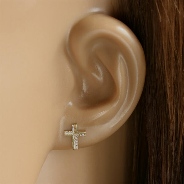 A 9K sárga arany fülbevaló egy keresztet ábrázol, amelybe szabálytalan vonalakban apró cirkóniák vannak beágyazva. A kerek cirkóniák átlátszóak. A fülbevaló felülete sima és tükörfényes. Stekkeres zárszerkezet. A fülbevaló mérete: 7 x 9 mmA fülbevaló súlya: 0,4 gFémjelzéssel ellátva. Az ár egy párra vonatkozik.
