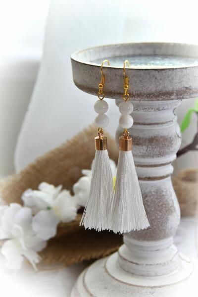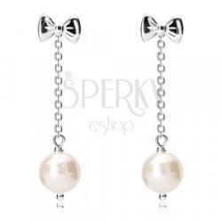 A 925 ezüst fülbevaló egy fényes masniból és egy fehér színű golyóból áll. A golyó gyöngyre emlékeztet. A masnit hat rövid bemetszés díszíti. A masni és a golyó között elhelyezkedő láncot ovális láncszemek alkotják, amelyek egymásra merőlegesen vannak összekapcsolva. Stekkeres zárszerkezet. A fülbevaló mérete: 8 x 35 mmA gyöngy mérete: 8 mmA fülbevaló súlya: