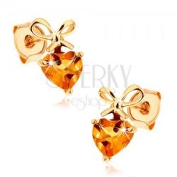 Bedugós fülbevaló 9K sárga aranyból, szintén sárga szív alakra csiszolt citrinből, amely felett egy vékony masni helyezkedik el. Biztonságos viselését stekker biztosítja. A fülbevaló méretei: 4 x 8 mmA fülbevaló súlya: 0,44 gFémjelzéssel ellátott. Az ár egy párra vonatkozik.
