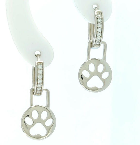 Ezüstszínű karika fülbevaló, melyet tappancs mintájú függő díszít és fehér cirkónia kristályok tesznek csillogóvá. A karika fülbevalóról a függő levehető, két külön fülbevalóként is használható. A kristályok karmos foglalatban helyezkednek el. Tartós ékszer, fürdéskor nem kell levenni, nem feketedik. Antiallergén ékszer. Fülbevaló teljes hossza: 25 mm. Kapcs