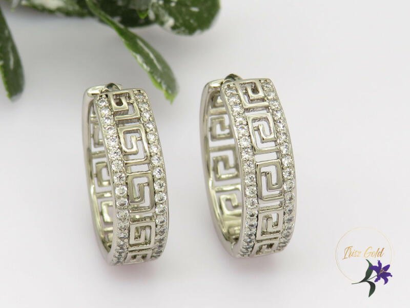 Antiallergén ezüst színű karika fülbevaló görög mintával, kis apró kövekkel Szin: rodium( ezüst szín) Méret: 20x5mm A forgalmazott divatékszerek alapanyaga nikkel és ólommentes ezért többnyire nem okoznak allergiás tüneteket, nyugodtan hordhatják fémérzékeny emberek is. Általában nem színezik a bőrt és más divatékszerekhez képest nagyságrendekkel jobb kopásálló