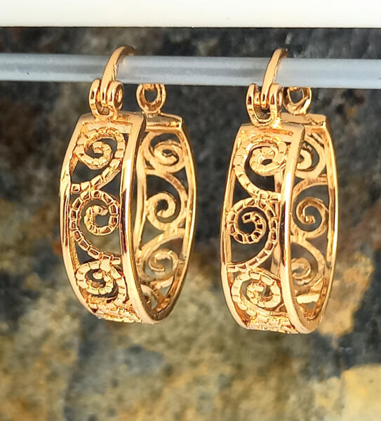 Aranyszínű karika fülbevaló, melyet áttört minta díszít. Időtálló darab, nem feketedik, nem színezi a bőrt, nehezen karcolódik ("gold filled"). Antiallergén ékszer. 18K arany színben kapható. Fülbevaló szélessége: 6 mm. Az antiallergén ékszerek olyan fémötvözetből készülnek, melyek nem irritálják a bőrt, nem okoznak allergiás reakciókat, ezért fémre érzékeny