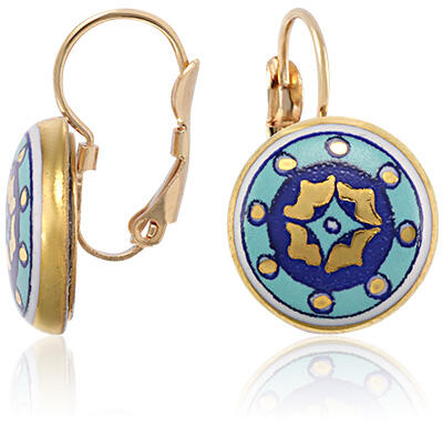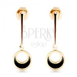 Fülbevaló 9K sárga aranyból kis kerek függő karikával a vékony ívelt pálcán. A karika felső részén kis kerek kivágás található, mely az alsó részen fekete félhold alakú fénymázzal végződik. A karika hátsó oldala apró gravírozott pöttyökkel díszített. A fülbevaló kapcsolása stekkeres. Fülbevaló mérete: 6 x 17 mmFülbevaló súlya: 0,7 gFémjelzéssel ellátot