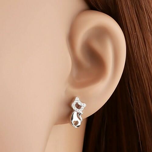 A 925 ezüst fülbevalónak macska alakja van, amelynek a teste szív alakú kivágással van díszítve. A macska fejét egy csillogó körvonal alkotja, amely átlátszó és kerek cirkóniákból áll. Biztonságos viselését stekker teszi lehetővé. Fülbevaló méretei: 7 x 11 mmFülbevaló súlya: 1,6 gFémjelzéssel ellátott. Az ár egy párra vonatkozik.