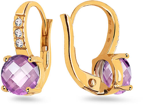 Gyönyörű fülbevaló sárga aranyból. A fülbevaló lila, kerek formájú ametiszttel és átlátszó cirkóniákkal tűnik ki. Az ékszer felülete magasfényű.
