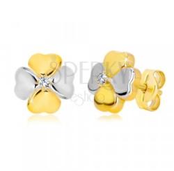 A 14K kombinált arany fülbevalót a szerencse szimbóluma alkotja. A négylevelű lóhere szív alakú levelei váltakozó sárga és fehér aranyból készültek. Középen egy kiemelt átlátszó cirkónia helyezkedik el, négykarmos foglalatban. Biztonságos viselését stekker teszi lehetővé. Fülbevaló méretei: 7 x 7 mmFülbevaló súlya: 0,6 gFémjelzéssel ellátott. Az ár egy párra