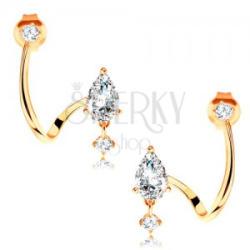 14K sárga arany fülbevaló amelyet cirkóniák díszítenek. A fényes felületű, hullámos ív végén foglalatban található a könnycsepp alakú, átlátszó cirkónia. Alatta egy kerek cirkónia függ. Biztonságos viselését stekker teszi lehetővé. Méret: 12 x 18 mmSúly: 1,7 gFémjelzéssel ellátott. Az ár egy párra vonatkozik.