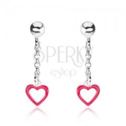925 ezüst fülbevaló, stekkerekből és fényes golyóból, amelyen egy lánc függ kerek szemekből. A láncra pedig egy szimmetrikus szív körvonal van erősítve rózsaszín színben. Biztonságos viselését stekker biztosítja. Méretek: 6,5 x 23 mmA fülbevaló súlya: 1,0 gFémjelzéssel ellátott. Az ár egy párra vonatkozik.