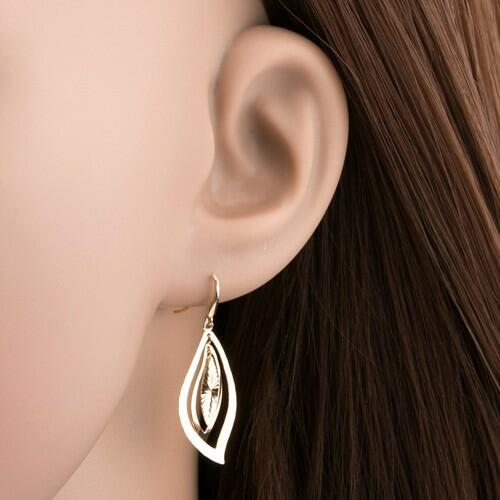 Fülbevaló 585 aranyból két lapos levélkörvonalból, miközben a nagyobbik felszíne díszített és a kisebbik fényes és sima. A kisebb körvonal közepében sugaras bevágásokkal díszített levél függ. A fülbevaló afrikai horgokra van akasztva. Fülbevaló mérete (zárszerkezettel): 12 x 32 mmSúlya: 1,4 gFémjelzéssel ellátott. Az ár egy párra vonatkozik.