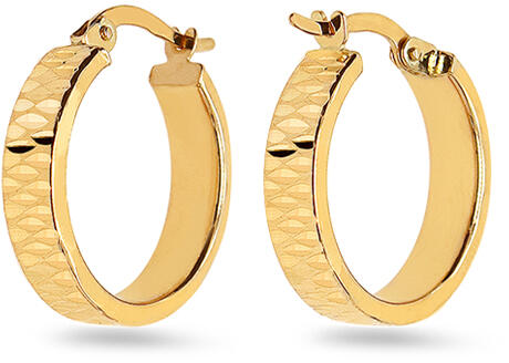 Ez a csodálatos, karika alakú fülbevaló, szögletes keresztmetszettel, klasszikus stílusának köszönhetően megfelelő lesz minden alkalomra. A fülbevaló felületi kezelése a csillogó gravírozás és a magas fény kombinációja, amelynek köszönhetően kiemelkedik a sárga arany szépsége. Zárszerkezete bepattintós, a biztonságos és kényelmes viselés érdekében.